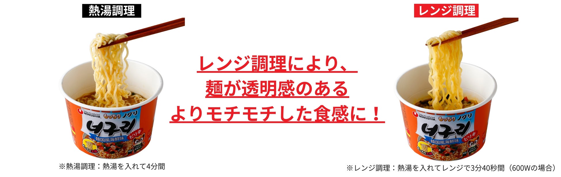 本製品は手軽なカップタイプでありながらも、ノグリの特長であるもちもちの麺がさらに“もっちり”に仕上がる「レンジ調理対応品」です。日本発売のノグリシリーズ製品では初めてレンジ調理を採用しています。電子レンジを用いた調理により、まるで鍋でじっくりと煮込んだような透明感のある麺になり、より”もっちり”とした食感をおたのしみいただけます。