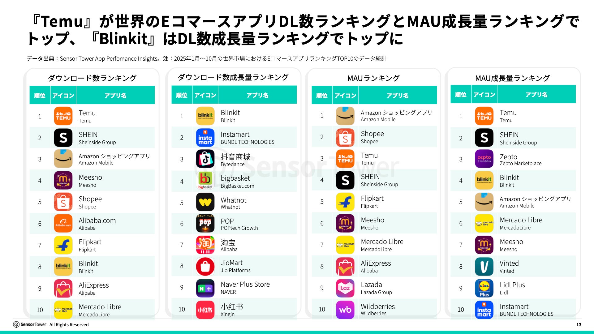 『Temu』が世界のEコマースアプリダウンロードランキングとMAU成長率ランキングでトップ、『Blinkit』はダウンロード成長率ランキングでトップに