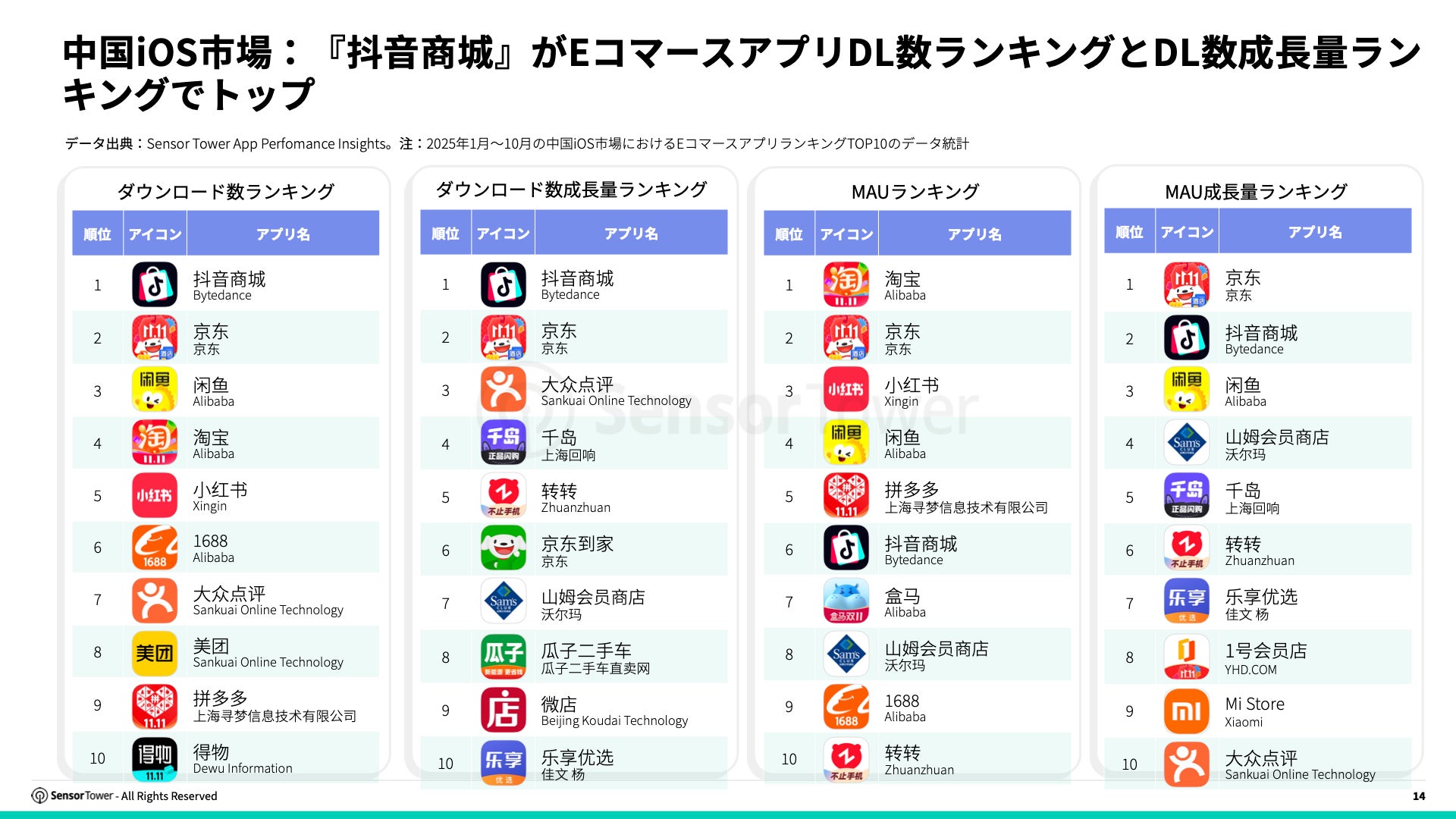 中国のiOS市場において、『抖音商城(Douyin Mall)』は目覚ましい活躍を見せ、ECアプリダウンロードランキングとダウンロード成長量ランキングの両方でトップを獲得しました。豊富なショート動画コンテンツとショッピングシーンの深い融合によって、プラットフォームは大量の新規ユーザーのダウンロードを獲得しただけでなく、アクティブユーザーの継続的な参加も促進しています。効率的なレコメンドアルゴリズムとパーソナライズされたショッピング体験によって、『抖音商城』は競争の激しいEC市場で頭角を現し、ブランドプロモーションとユーザー転換の重要なチャネルとなっています。