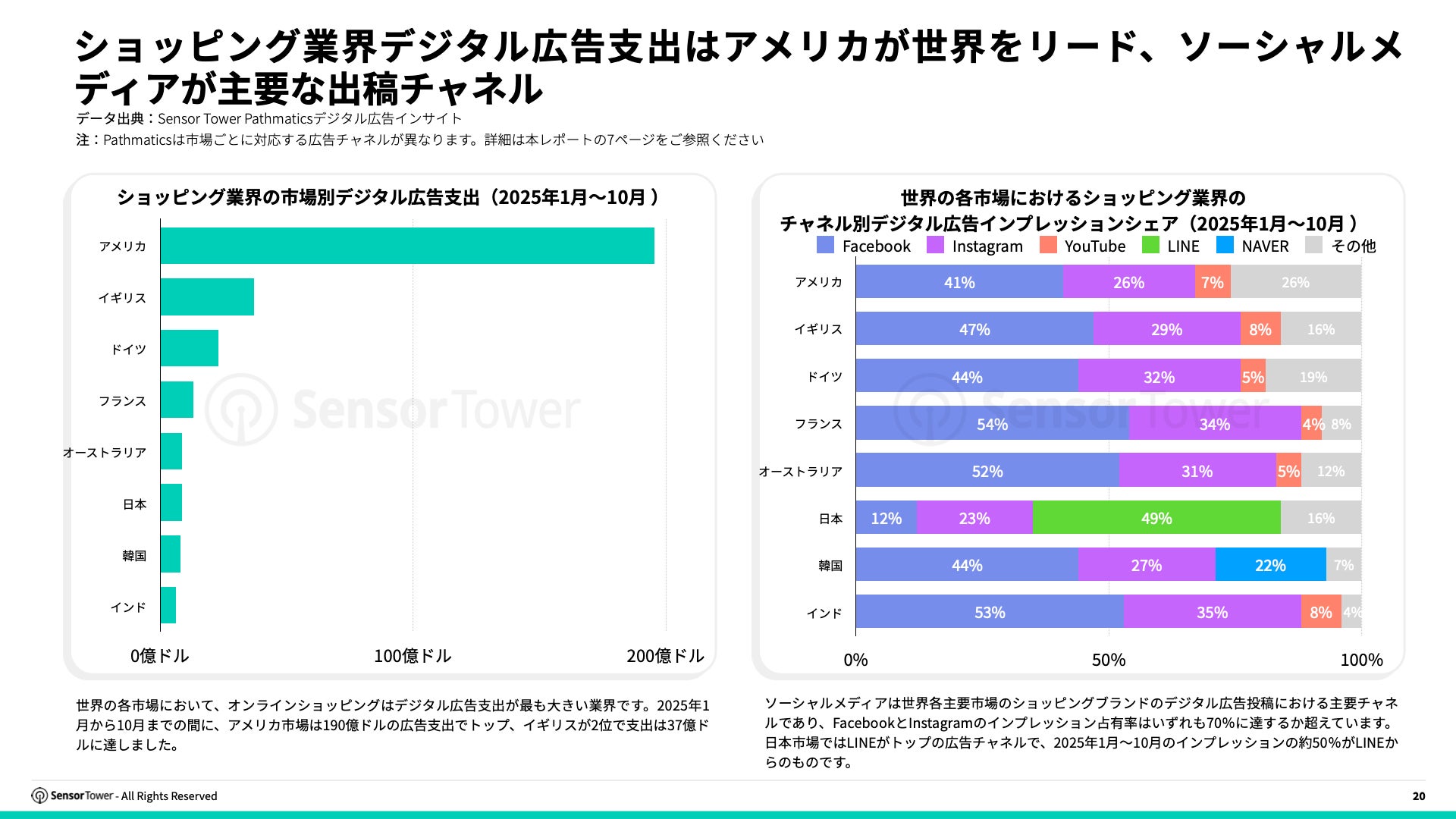 ソーシャルメディアプラットフォームは、世界各市場のショッピングブランドがデジタル広告を配信する主要なチャネルであり、その中でもFacebookとInstagramの広告インプレッションはいずれも70%以上を占めています。日本市場では、LINEが主導的な地位を占めており、2025年1月から10月にかけて広告インプレッションは50%近くに達しています。