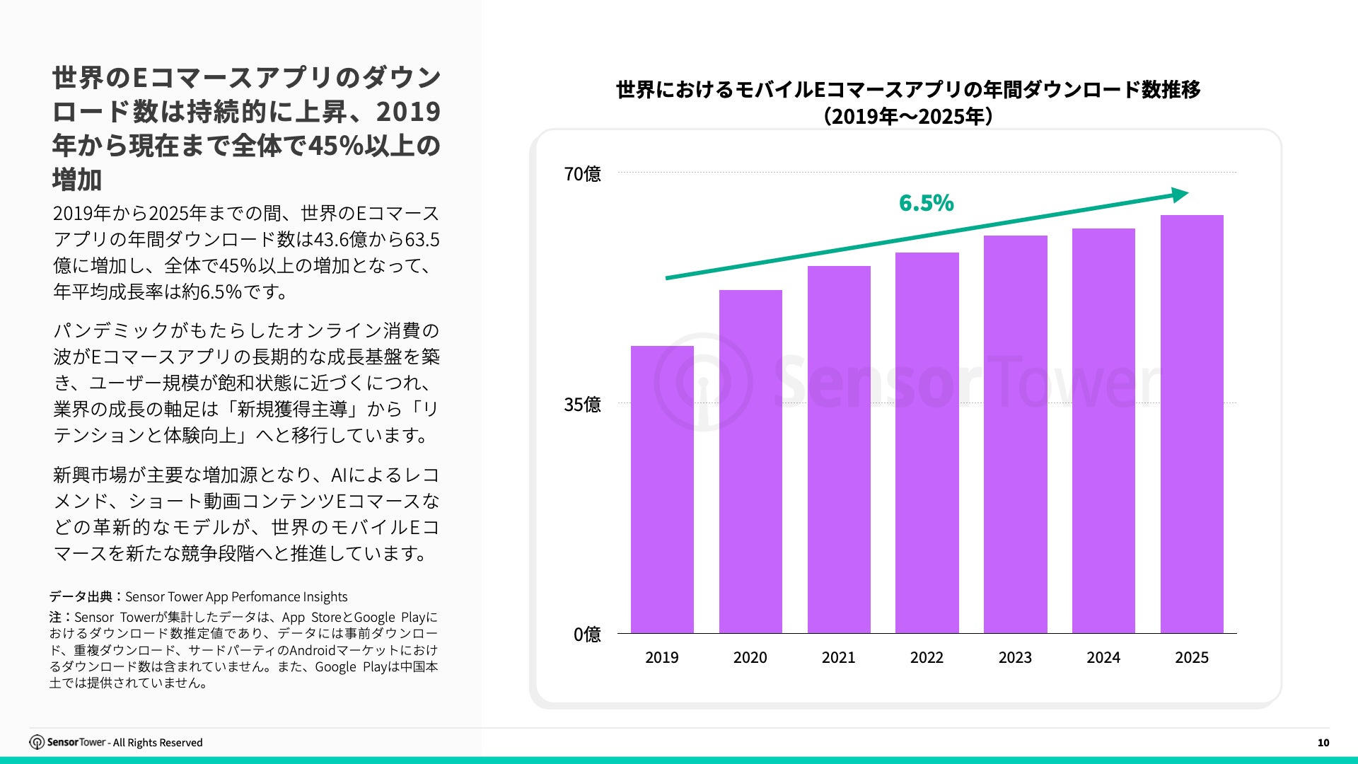 2019年~2025年世界のEコマースアプリダウンロード数の年平均成長率は6.5%