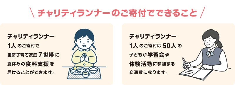 チャリティランナーの方々からのご寄付は、こういったご家庭への食料支援や、子どもたちの学習・進学支援のために大切に活用させていただきます。ぜひキッズドアのチャリティランナーとなって、私たちと一緒に子どもたちの成長や未来を応援してください!