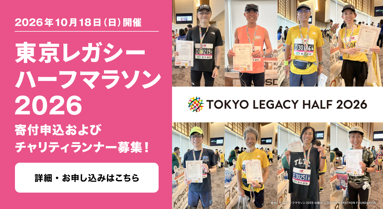 2026年10月18日(日)に開催が予定されている東京レガシーハーフマラソンチャリティは、東京レガシーハーフマラソンを通して、チャリティ活動の輪を広げる取り組みです。寄付先団体が設定する寄付金額以上をいただいた方の中でご希望の方は、チャリティ活動をアピールしていただくチャリティランナーとして東京レガシーハーフマラソン2026に参加することができます。この度、東京マラソン2026チャリティの寄付先団体であるキッズドアも参加が決定し、本日から寄付申込およびチャリティランナーの募集を開始しました!