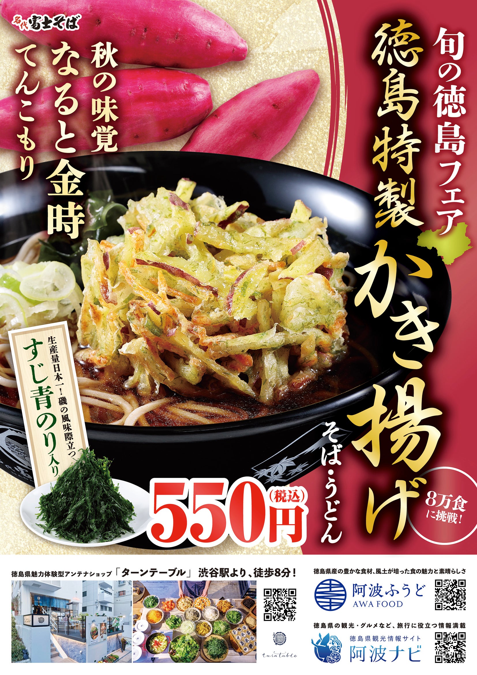11月1日から、「名代 富士そば」首都圏全113店舗で、徳島を代表する秋の味覚「なると金時」と、秋から冬にかけて旬を迎える「すじ青のり」を使ったメニュー「徳島特製かき揚げそば」を提供開始します。