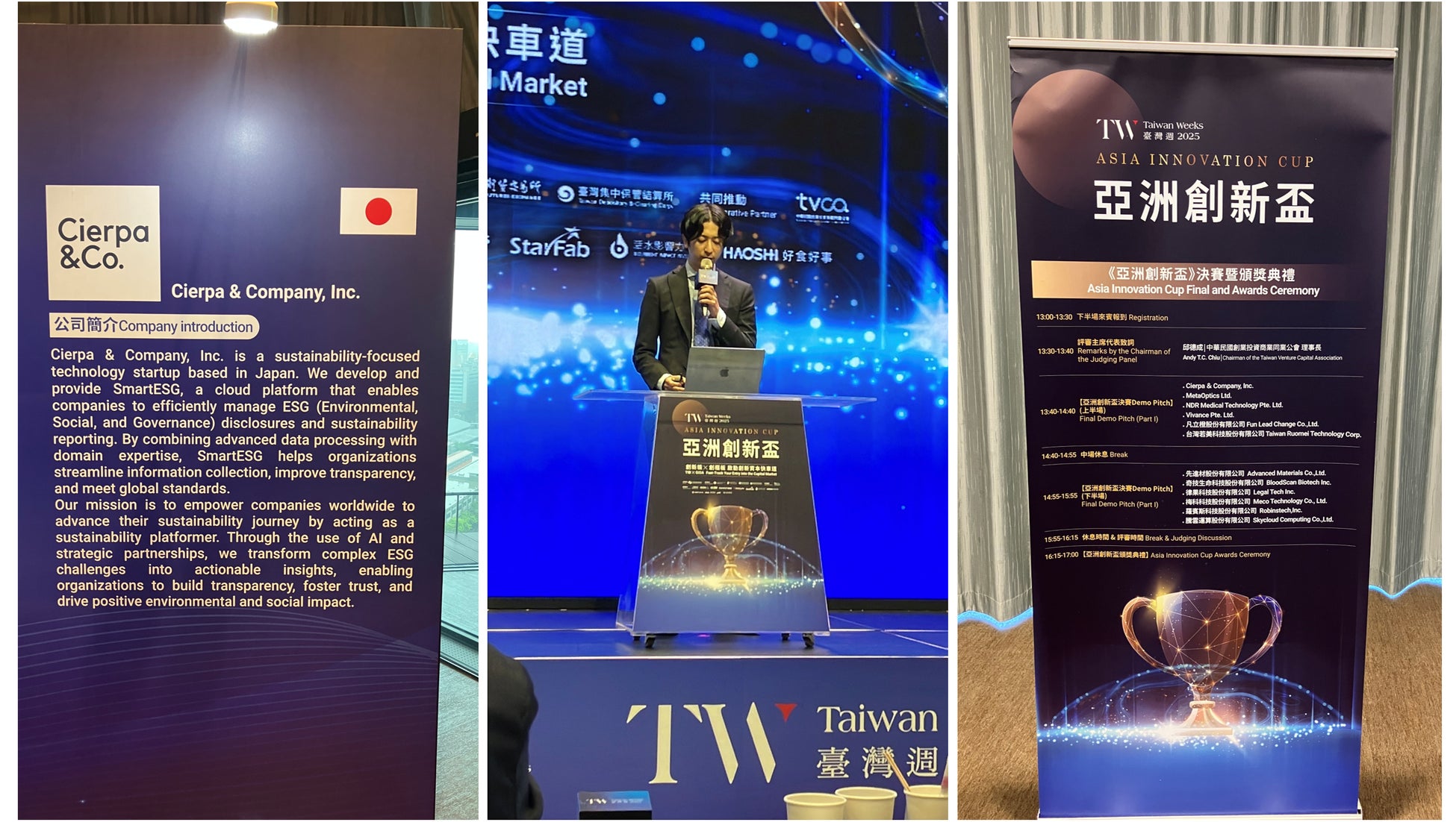 当社は、アジア地域におけるイノベーションおよびグローバル資本市場との接点を深めることを目指し、本イベントに初参加しました。現地では、当社の技術や「SmartESG」をはじめとするソリューションを紹介し、現地企業や投資家、業界関係者とのネットワーキングを行いました。また、有望なスタートアップを台湾内外から発掘するコンテスト「Asia Innovation Cup」にエントリーし、当社は最終ラウンドで登壇しプレゼンテーションを行いました。