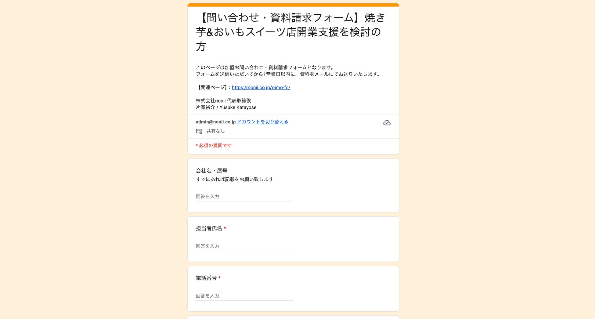 【問い合わせ・資料請求フォーム】焼き芋&おいもスイーツ店開業支援を検討の方 - Google フォーム