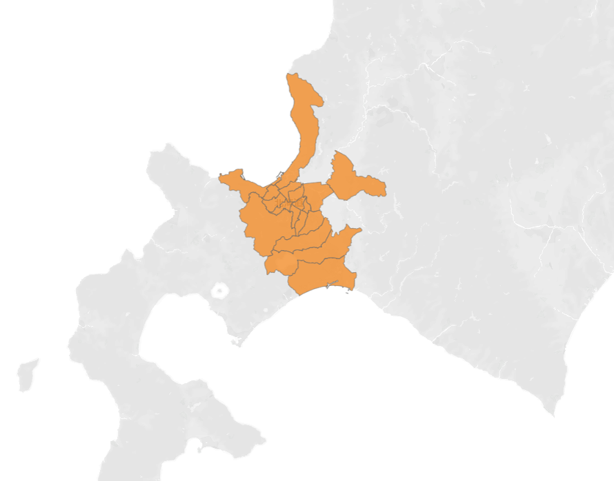 北海道 : 札幌市中央区、札幌市北区、札幌市東区、札幌市白石区、札幌市豊平区、札幌市南区、札幌市西区、札幌市厚別区、札幌市手稲区、札幌市清田区、小樽市、岩見沢市、苫小牧市、江別市、千歳市、恵庭市、北広島市、石狩市