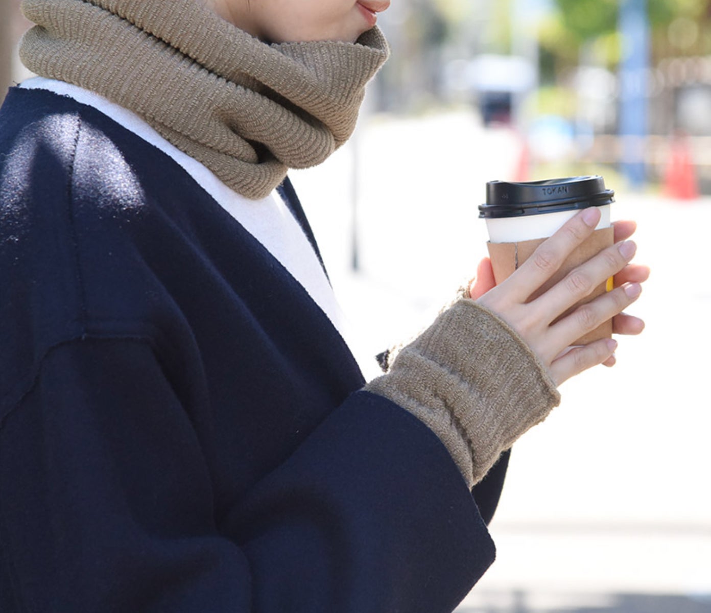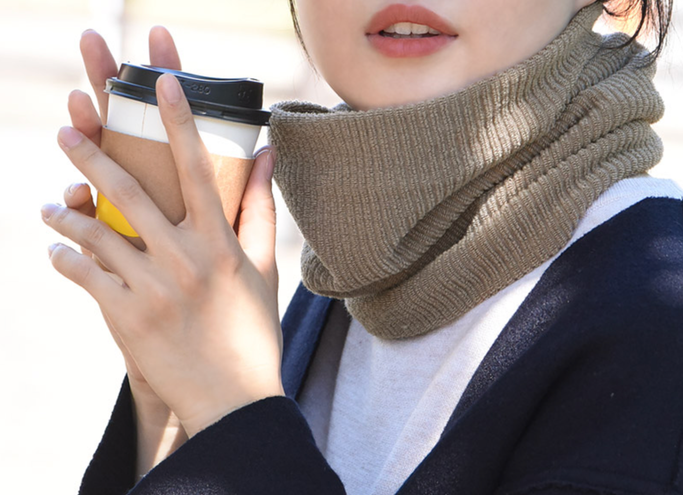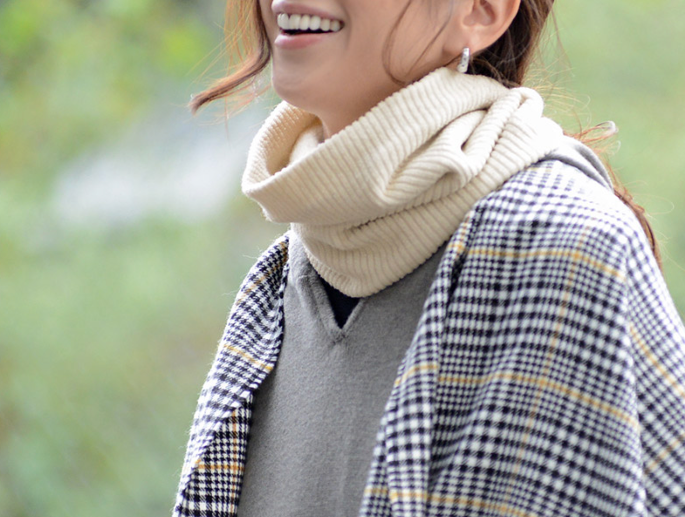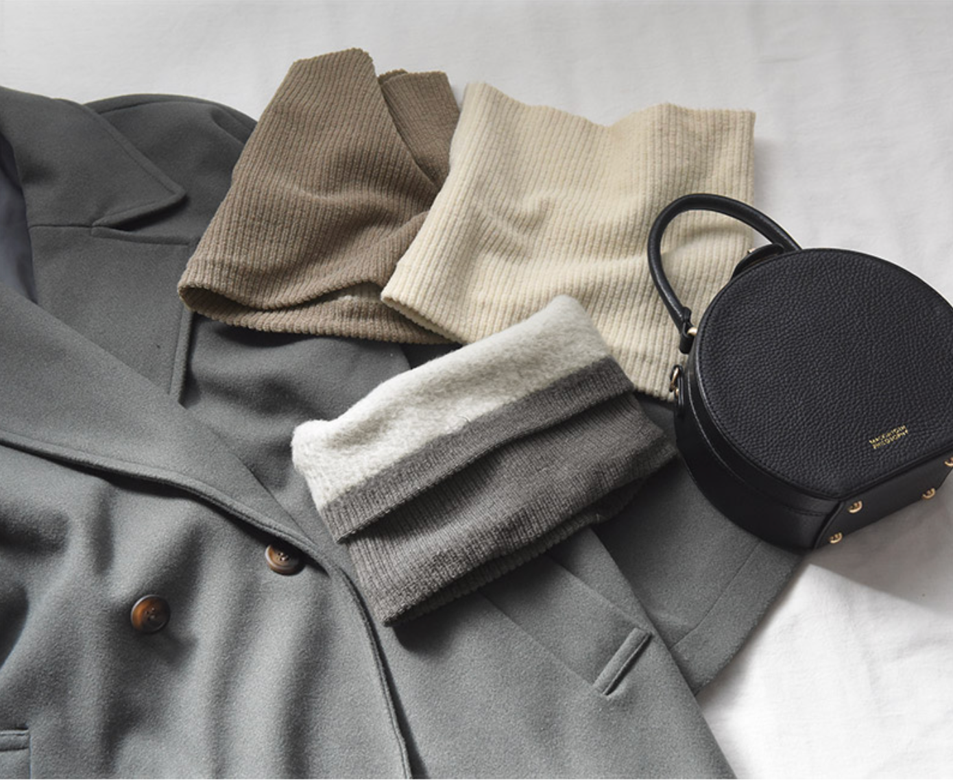 ネックウォーマーといえば、アウトドアやスポーティーに見えるフリース素材や、ツルッとした表面感でインナーに見えてしまうデザインが一般的。