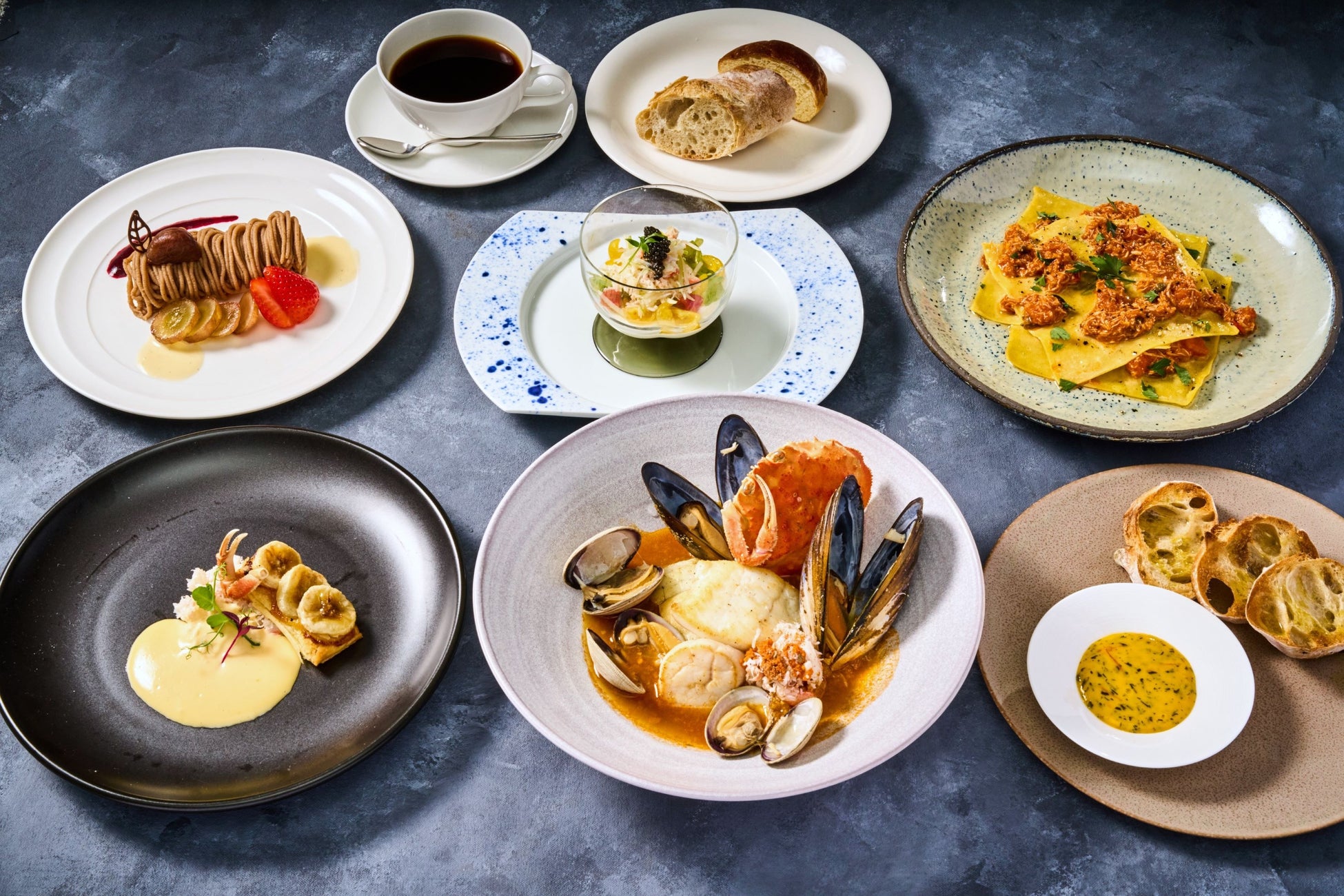 アミューズの「トマト香る 香箱ガニとモッツァレラチーズのババロア」は、なめらかな口当たりとミルキーな味わいのババロアにトマトの酸味が調和し、香箱ガニの身の旨味が引き立ちます。仕上げにキャビアをトッピング。前菜には「香箱ガニとバナナタルト カニみそ入りオランデーズソース」を。贅沢に盛った香箱ガニのほぐし身を、濃厚なカニみその風味とバターのコクが食欲をそそるオランデーズソースでお召し上がりください。パイ生地にアーモンドクリームが香る軽い食感のバナナタルトとの相性も抜群です。