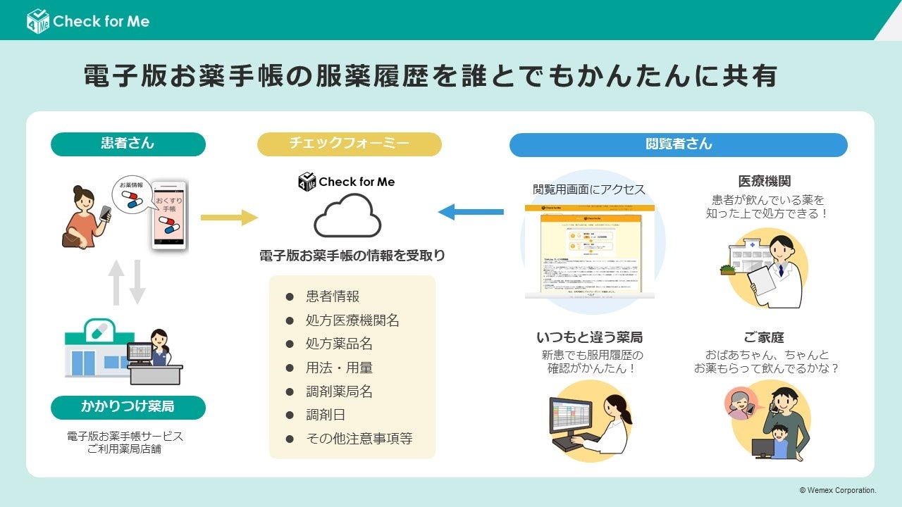 PHCホールディングス株式会社(本社:東京都千代田区)傘下のウィーメックス株式会社(本社:東京都渋谷区、代表取締役社長:高橋秀明、以下「ウィーメックス」)は、このたび、ウィーメックスが特許技術として保有する、服薬履歴共有機能「Check for Me」を、日本調剤株式会社(本社:東京都港区芝、代表取締役社長:笠井直人、以下「日本調剤」)の提供する電子版お薬手帳アプリ「お薬手帳プラス」に提供を開始することをお知らせします。「Check for Me」は、ウィーメックスの電子版お薬手帳アプリ「ヘルスケア手帳」(*1)に導入されていますが、他社アプリへの機能提供は今回が初めてとなります。