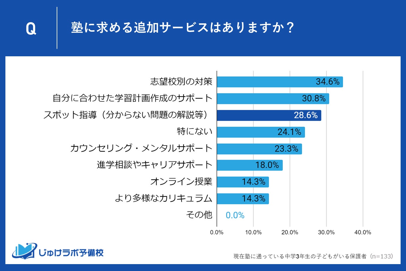 じゅけラボ予備校(所在地:大阪市北区、代表取締役:後藤智則)は、現在、通塾している中学生3年生の保護者133名を対象に、志望高校選びに関する意識調査を実施しました。
