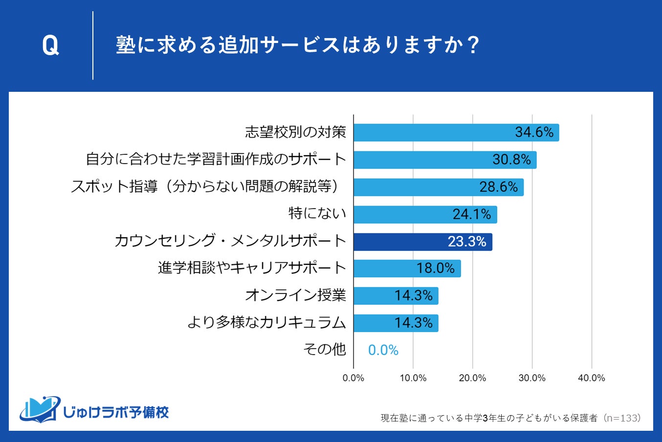 最も多い34.6%の保護者が「志望校別の対策」を追加サービスとして求めています。保護者たちは、子供が希望する志望校に合格するためには、より具体的で個別の対策が必要であると感じています。志望校ごとの試験傾向や対策が充実することで、子供の合格可能性を高めたいという強い意識が反映されています。
