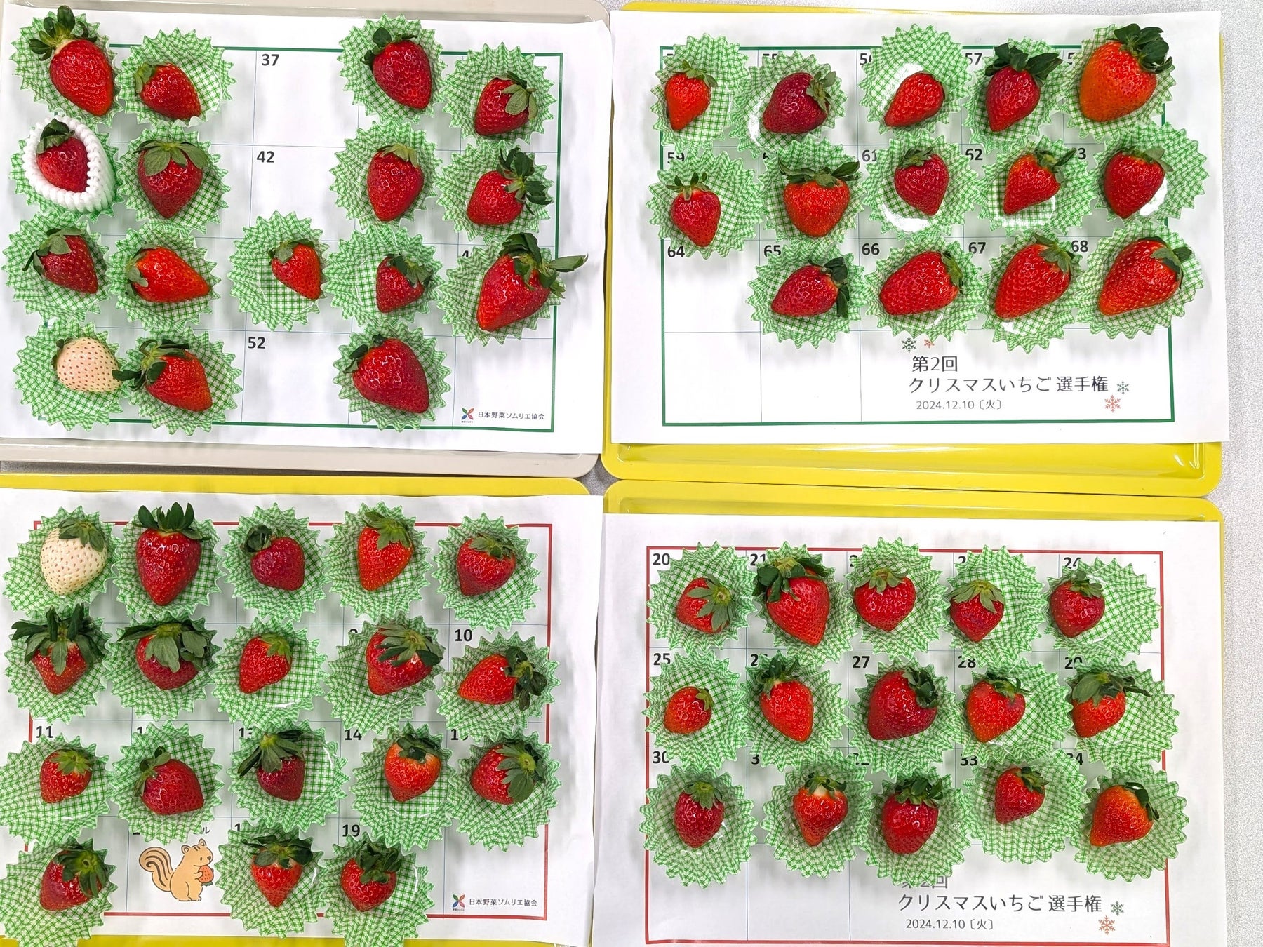 一般社団法人日本野菜ソムリエ協会(所在地:東京都中央区、代表理事:福井栄治)は、2024年12月10日(火)に、クリスマスシーズンの12月においしい『冬いちご』を決める「クリスマスいちご選手権」(以下、本選手権)を開催しました。今年は昨年より大幅にエントリー数が増え、全国から63品が集まりました。評価員である野菜ソムリエが商品名や産地、生産者情報などを伏せて食味。そのおいしさを審査し、評価員全員の合計点数によって各賞を決定しました。審査の結果、「第2回クリスマスいちご選手権」の最高金賞は、埼玉県本庄市の『べにたま -X-』(久米原農園 8代目 美幸)に輝きました。埼玉県産のいちごが2年連続で最高金賞を受賞する中、栃木県産のとちあいか、埼玉県産あまりんが上位に選ばれた。