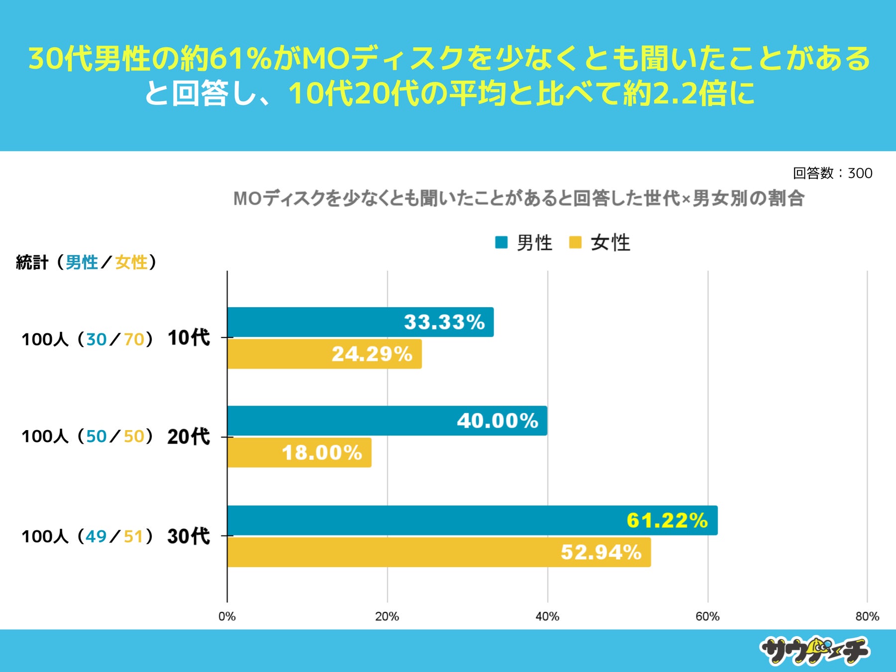 【30代男性の約61%がMOディスクを少なくとも聞いたことがあると回答し、10代20代の平均と比べて約2.2倍に】
