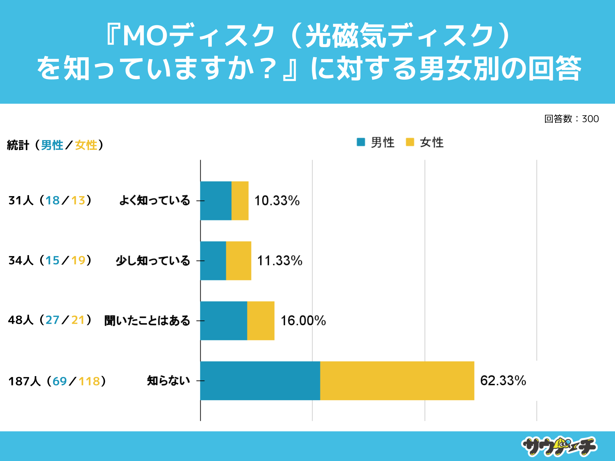 10〜30代男女を対象とした『MOディスク(光磁気ディスク)を知っていますか?』というアンケートで、最も多かった回答は「知らない」で約62%でした。