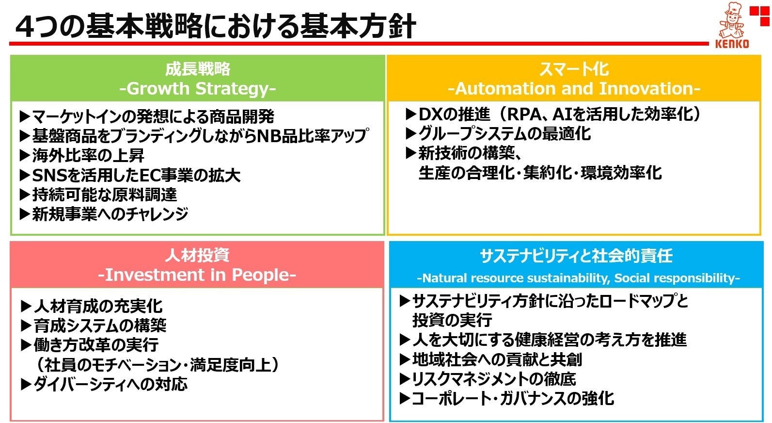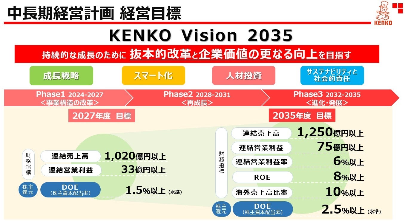 近年大きく変化した社会環境のなか、インフレへの転換による原料や人件費の高騰、日本の人口減少や高齢化、気候変動や地政学的リスク等、当社グループの事業環境も大きく変動しております。当社グループは理念体系の再構築、重要課題の見直しとマテリアリティの特定をし、持続的な成長のための抜本的改革と企業価値の更なる向上を基本方針とした中長期経営計画『KENKO Vision 2035』を策定しました。当社では従来、3か年での中期経営計画を推進してまいりましたが、今回は当社グループのありたい姿を想像し、当社としては初となる長期的視点での12年後を見据えた内容としています。