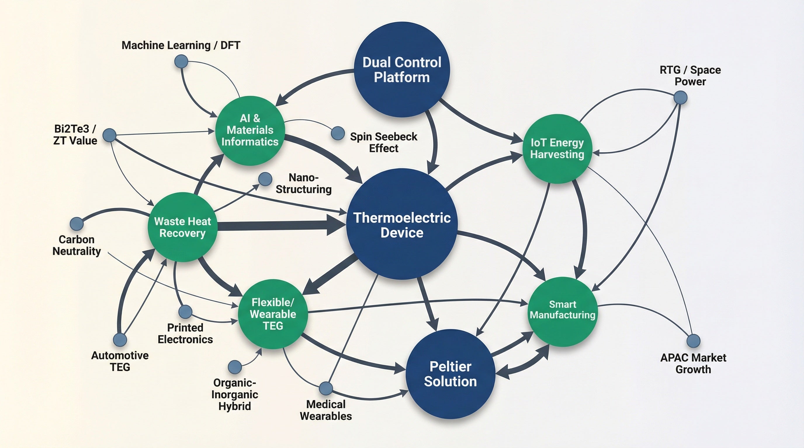 日中韓3ヵ国は、熱電材料・モジュール・AIデバイス設計の三軸で世界の製造・研究基盤を担うAPACエコシステムを形成しており、グローバル市場の最高成長率をけん引する。日本企業には素材・精密制御領域での差別化と、アジア内サプライチェーン統合が求められる。
