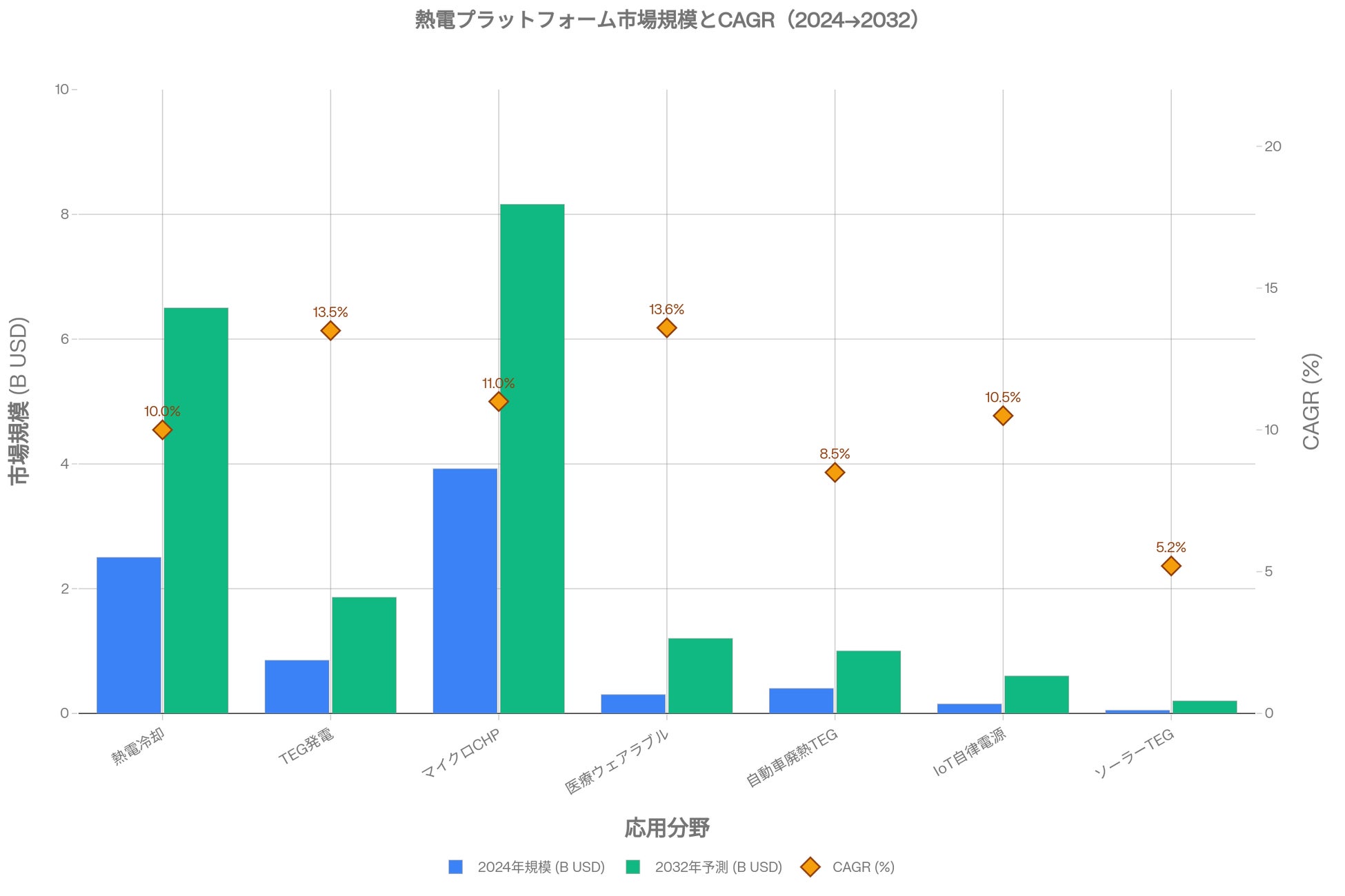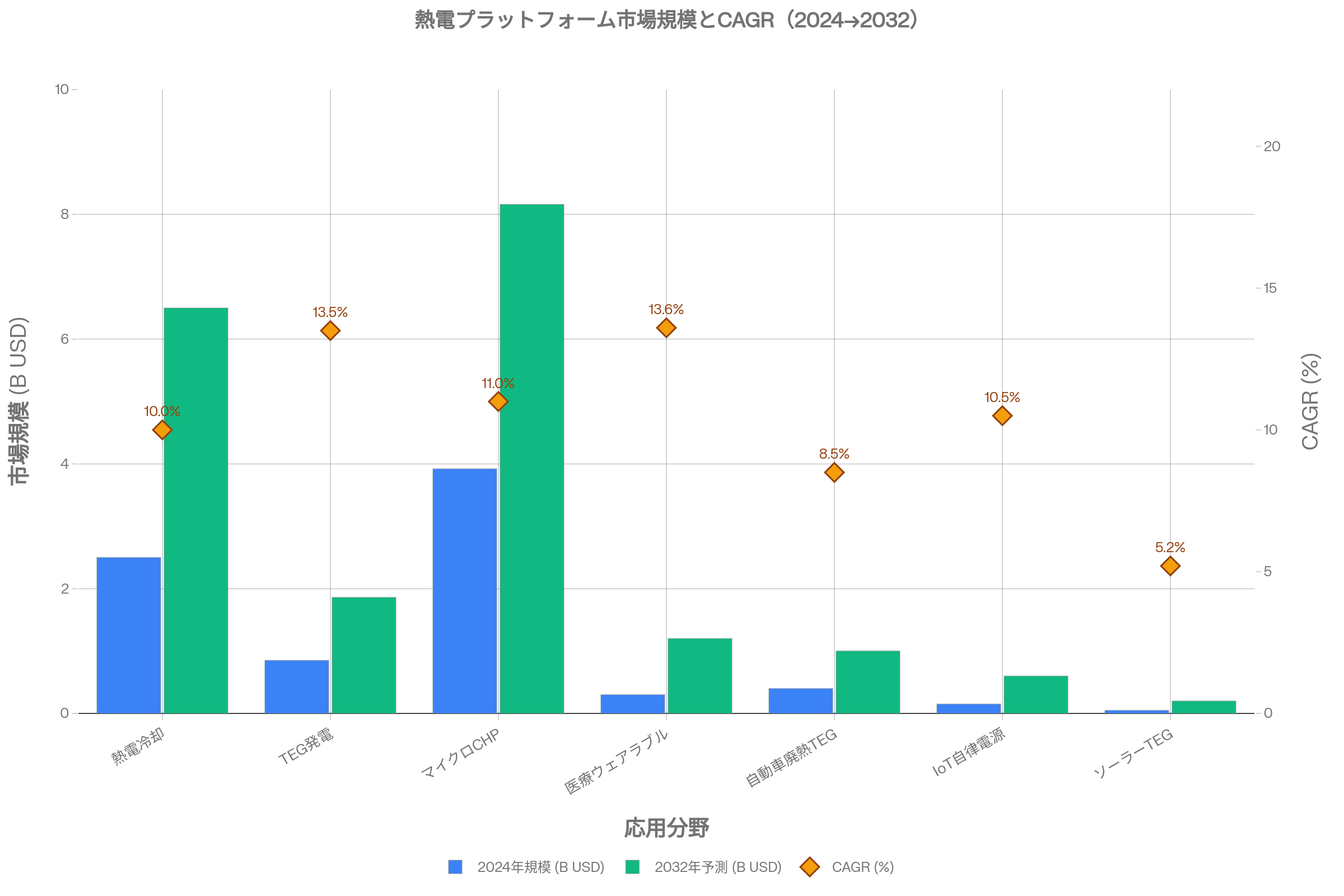 医療デバイスセグメントはCAGR 13.6%と全応用分野で最高の成長率が見込まれる。体温差発電・ペルチェ冷却デュアル制御・AI診断連携によるエネルギー自立型医療パッチは、2027〜2030年の量産期に向けて今から開発基盤を整備すべきである。