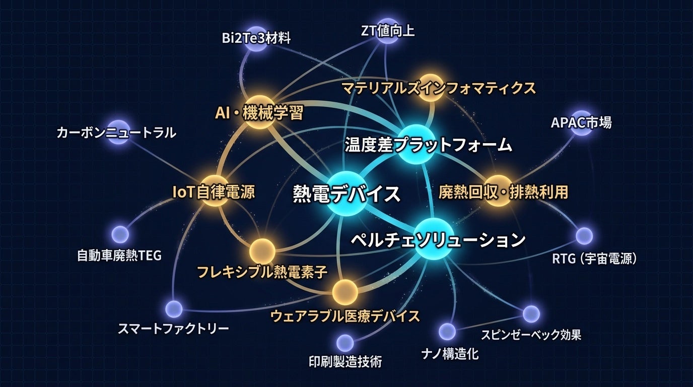 本白書は、熱電デバイス(TEG/ペルチェ素子)を軸に、廃熱回収・IoT自律電源・ウェアラブル医療・AI材料設計という4つの技術潮流を縦断する包括的産業レポートである。