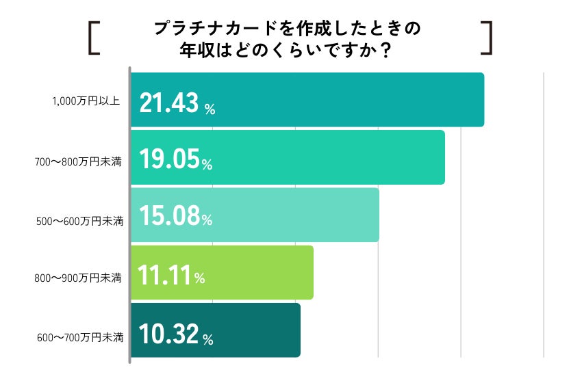 プラチナカードを作成したときの年収は、「1,000万円以上」と答えた人が21.43%と最も多かった。