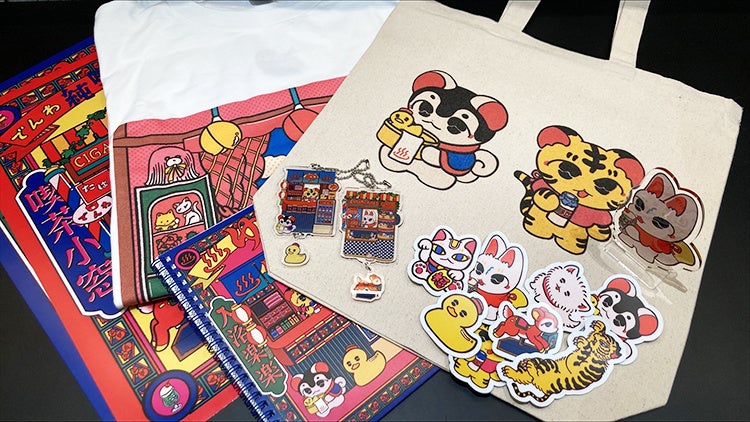 今回展示のために描き下ろされたアートを使用したステッカー、アクリルスタンド、ゆらゆらチャームなど、オリジナルグッズを会場で販売します。さらに、キンコーズのオンラインストア「kinko’s fab」でも、11月8日(金)〜11月30日(土)の期間限定でオンライン販売を実施します。