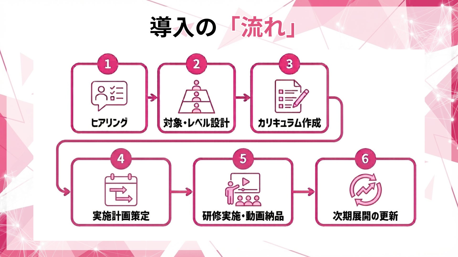初回の情報交換では、対象別カリキュラム案、提供形態(研修/動画)の最適案、社内展開の導線設計のたたき台をご提示します。