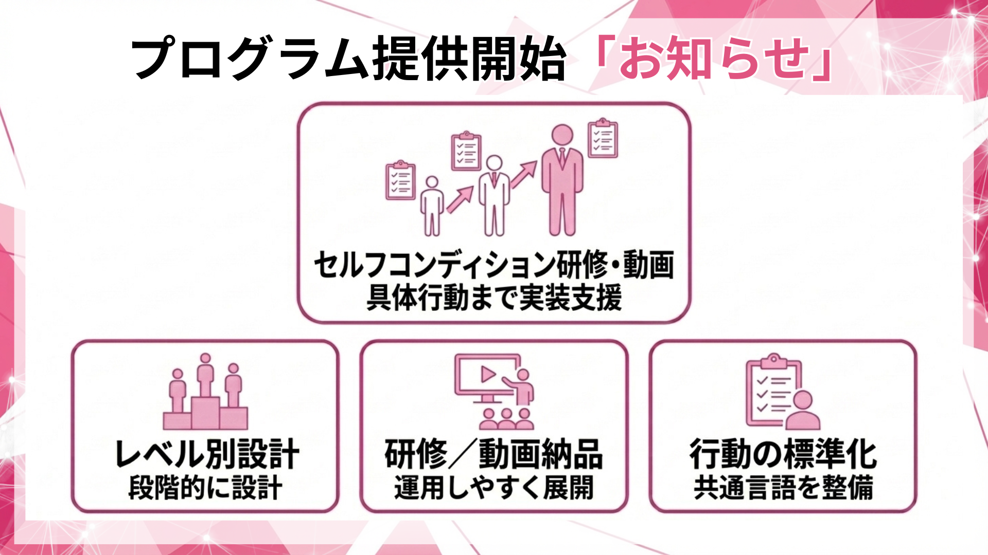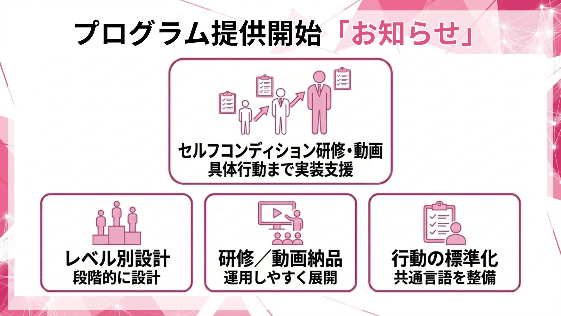本プログラムは、従業員のセルフコンディションを「気にかける」で終わらせず、レベル別・対象別に具体行動まで標準化し、研修または動画納品で実装するプログラムです。