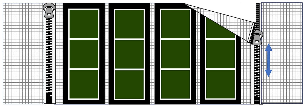 本工法は、ペロブスカイト太陽電池付きのシートと屋根や壁面に所定の間隔で固定したメッシュシートをファスナーで固定します。シートは通気性の良いメッシュシートで、耐候性の高い特殊ファスナーを使用しています。大面積でもファスナー部分で容易に連結でき、部分的に交換することが可能であり、長期的な保守性に優れています。今後は長期設置による耐久性の検証や、実際の取り替え工事を通じた施工性の評価も予定しています。
