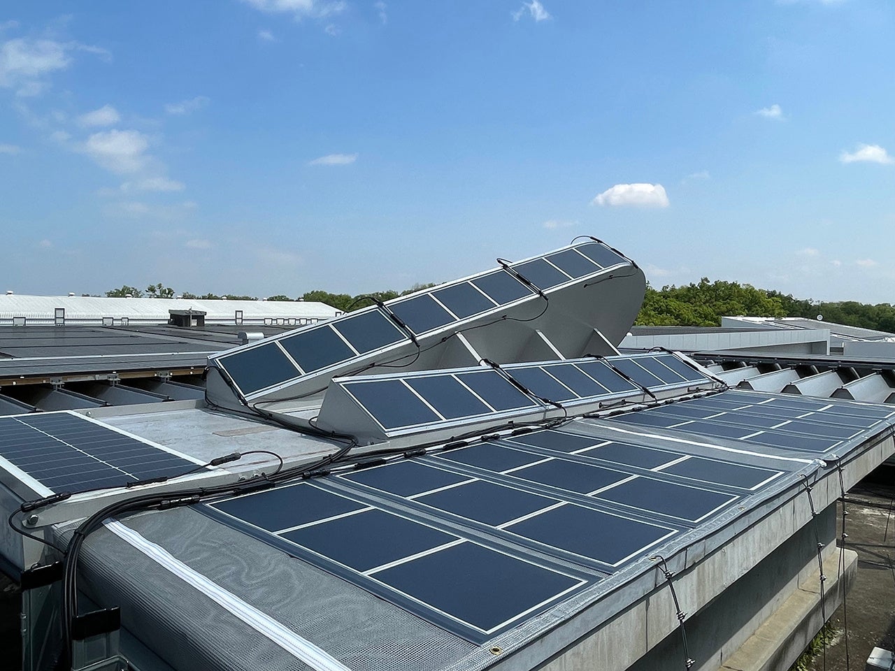 ペロブスカイト太陽電池の軽量で柔軟、低照度時の発電効率が優れているという特長を活用し、効率的に年間の発電量を最大化させる設置形状をシミュレーションにより算出して、同技術研究所本館の屋上に設置しました。