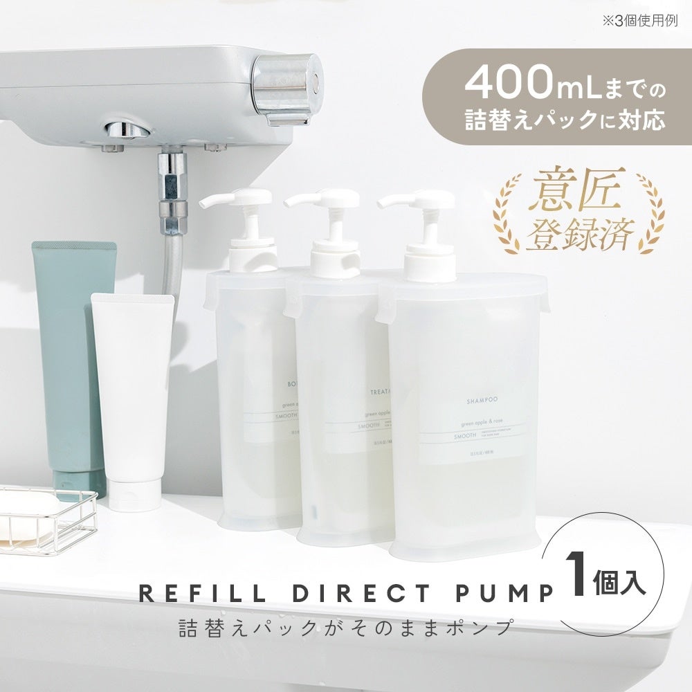 詰替えパックごとスッポリ!シャンプーなどの詰替えに便利なディスペンサー。「詰替えパックがそのままポンプ」が新登場!