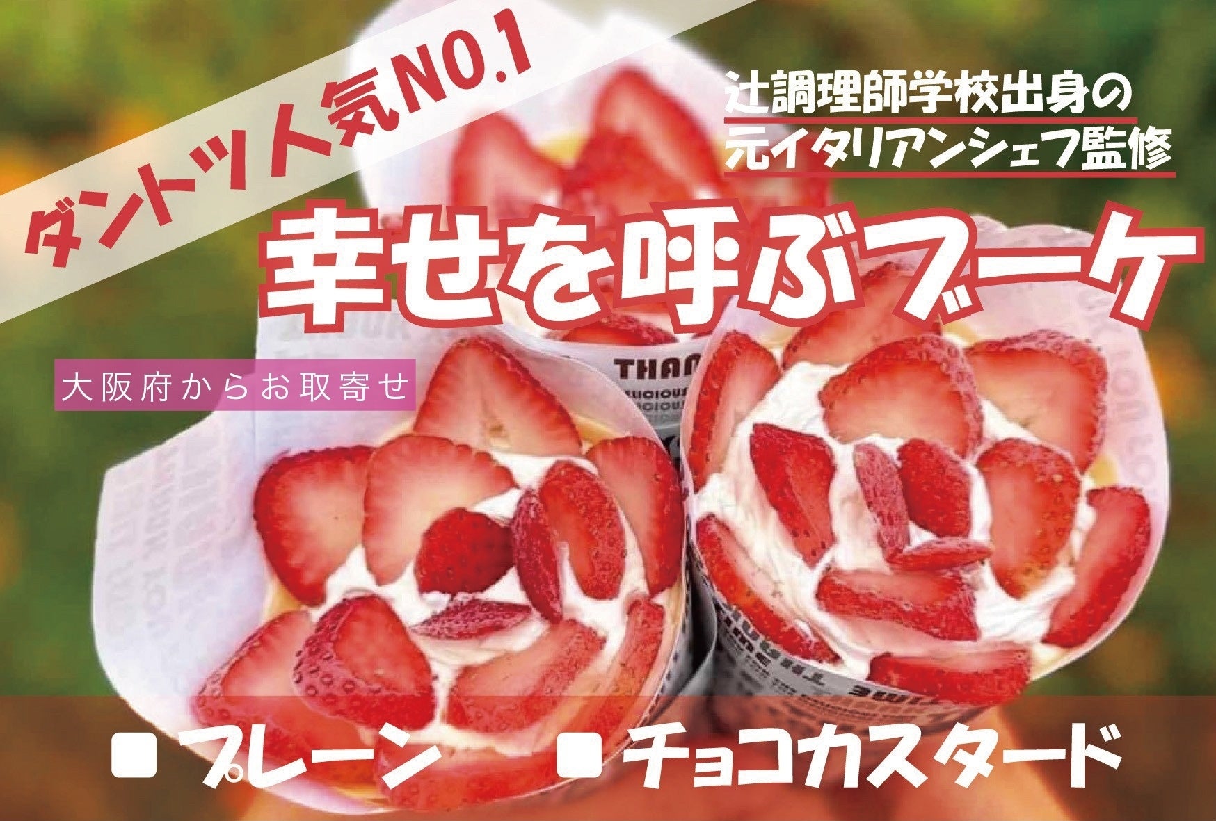 スライスしたいちごがバラの花びらのようにクレープの上にぐるりと飾られ、名前の通り花束のように映えるとSNSを中心に話題沸騰!