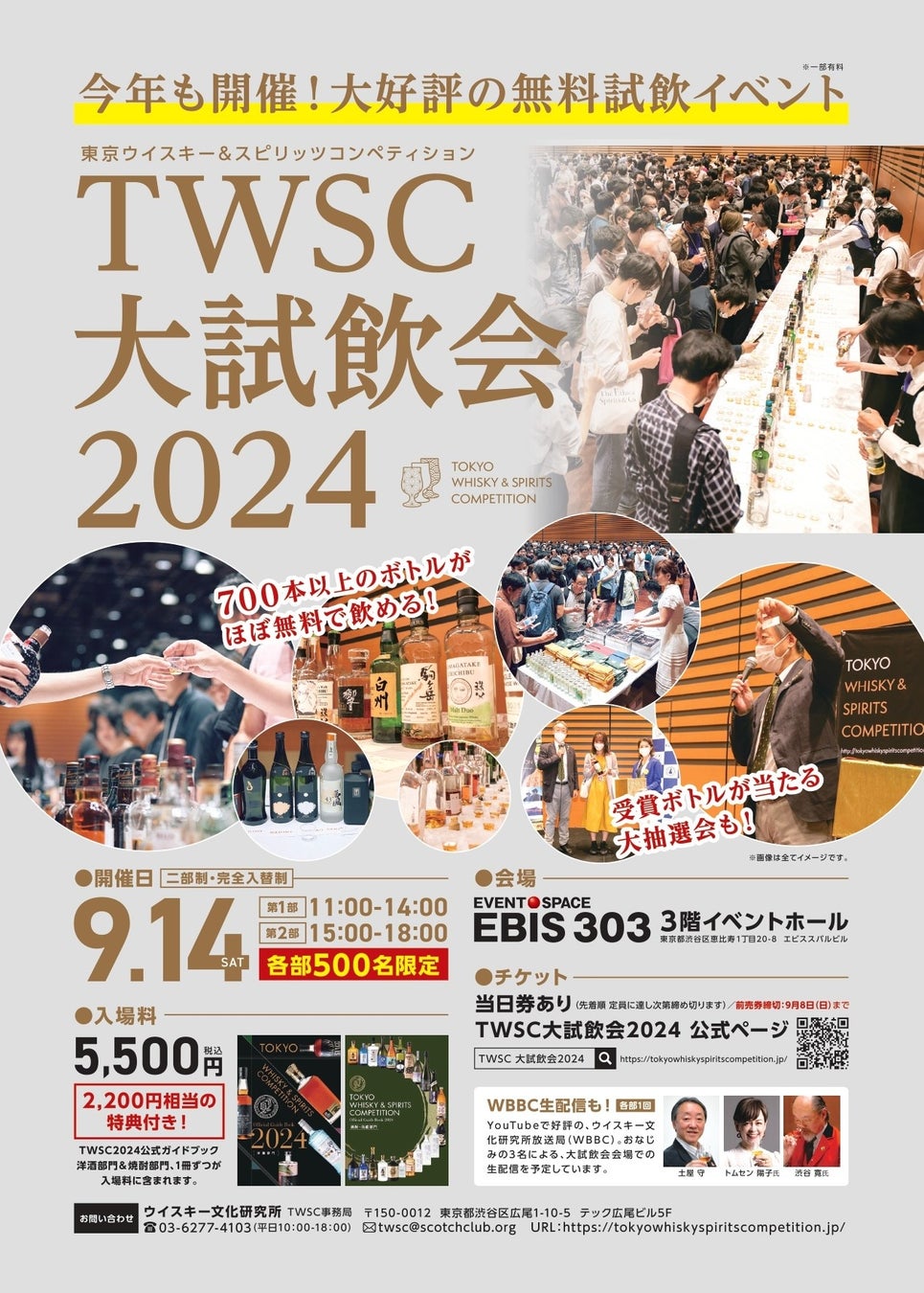 日本唯一、アジア最大級の蒸留酒のコンペティション『東京ウイスキー&スピリッツコンペティション』(以下:TWSC)では、9月14日(土)にEBiS303イベントホール(東京都渋谷区)で『TWSC大試飲会 2024』を開催いたします。