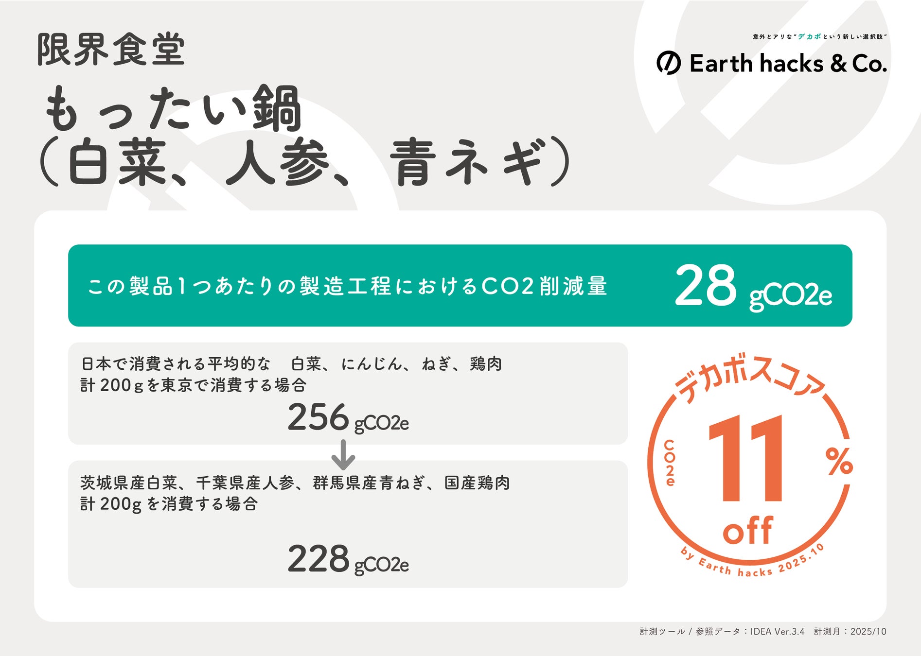たとえば、白菜、にんじん、青ねぎを選択して、ベースの鍋出汁と鶏肉を加え「もったい鍋」を楽しんだ場合、デカボスコアは11%となります(*3)。デカボスコアは、商品やサービスのCO2e(*4)排出削減率を可視化したマークです。お客さまが商品やサービスを選ぶ際の、環境価値における新しい選択基準として提供されています。「もったい鍋」のように、賞味期限が近づいた食材を選ぶだけで二酸化炭素排出量削減に貢献することができます。