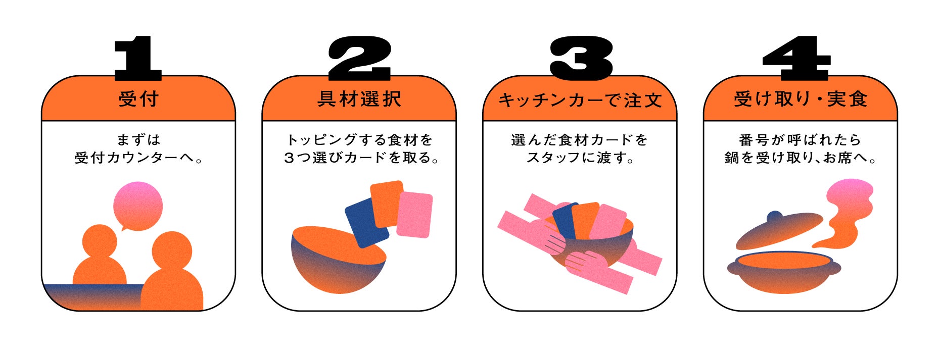 選んだ食材カードをスタッフにお渡しください。選んだ食材とベースの鍋出汁、お肉をキッチンカーで調理し、「もったい鍋」をご提供します。熱々の鍋をお楽しみください!