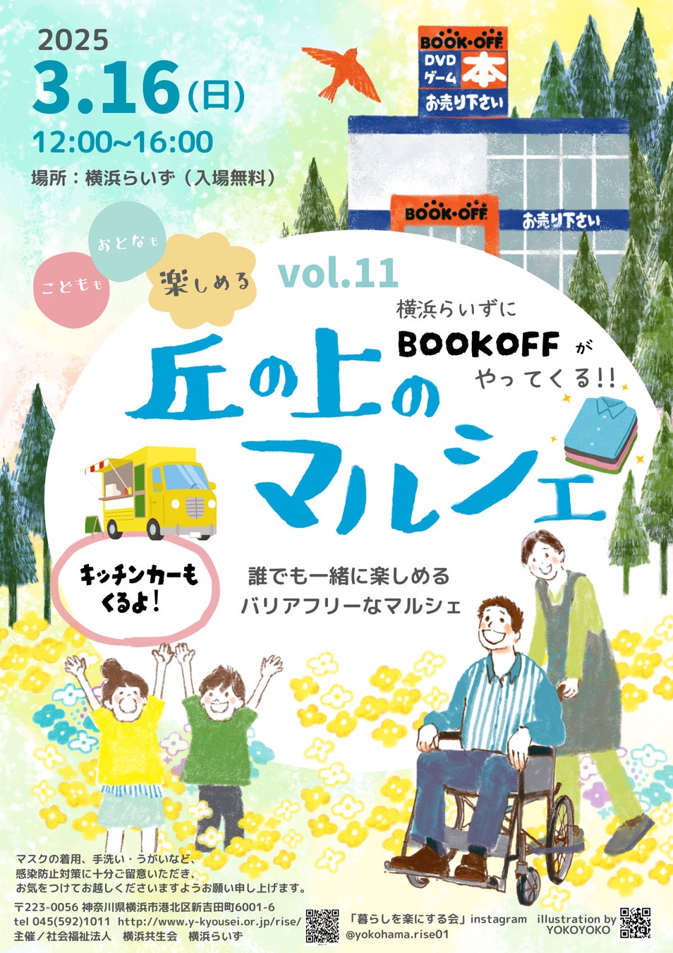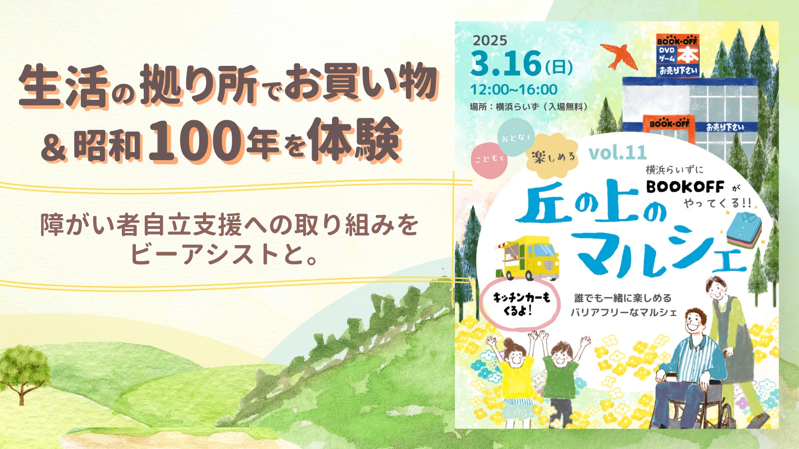 ブックオフグループホールディングス株式会社(本社:神奈川県相模原市、代表取締役社長:堀内 康隆、以下、ブックオフ)は、外出が困難な施設のご利用者さまに、BOOKOFFの店舗体験やブース体験を通してお買い物やリユースによる繋がりを身近に感じていただく機会を創出するため、2025年3月16日(日)に横浜市港北区の障がい者支援施設、社会福祉法人横浜共生会 横浜らいずが主催する第11回「横浜らいず 丘の上のマルシェ」に出展いたします。本出展は、ブックオフグループの障がい者雇用を促進する特例子会社でありグループ会社の業務支援事業などを行うビーアシスト株式会社(本社:神奈川県相模原市、代表取締役社長:森 葉子、以下、ビーアシスト)と共同で実施。障がいを持つパートナースタッフと共に、挑戦や個性の発揮場所を増やすことを目指してまいります。