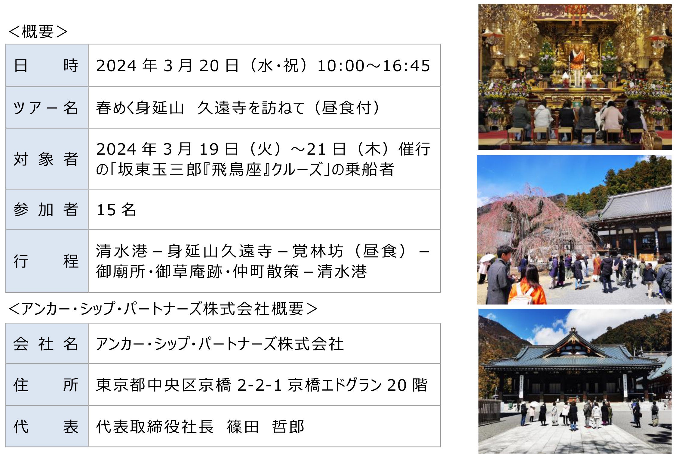 株式会社山梨中央銀行(頭取 古屋 賀章)は、アンカー・シップ・パートナーズ株式会社との連携により、清水港に寄港した豪華客船「飛鳥Ⅱ」の乗船者を対象とした山梨県への日帰り寄港地観光ツアーを企画しました。