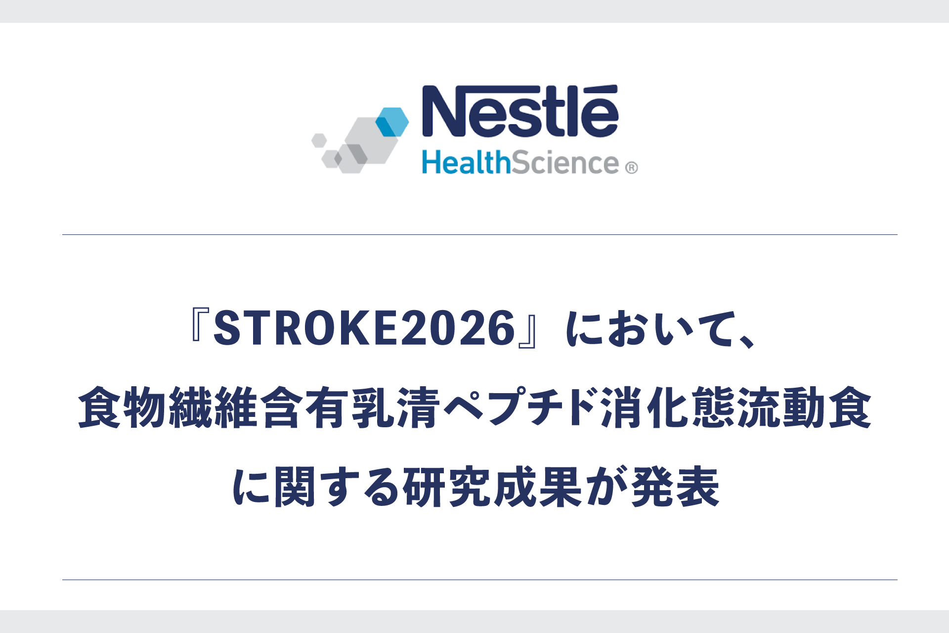 2026年3月12日から14日まで大阪市で開催された『STROKE2026※1』において、順天堂大学医学部附属浦安病院 脳神経内科の栗田 尚英先生により「急性期虚血性脳卒中における高発酵性食物繊維含有経腸栄養剤の投与」の研究成果が発表されました。本研究は、臨床研究法に基づく特定臨床研究※2として実施され、ネスレ日本株式会社 ネスレ ヘルスサイエンス カンパニー(本社:兵庫県神戸市、カンパニープレジデント:中島昭広)は、本研究の実施に際し、順天堂大学医学部附属浦安病院との臨床研究契約に基づき、研究資金を提供しました(本研究の計画や実施、発表に対して関与しませんでした)。
