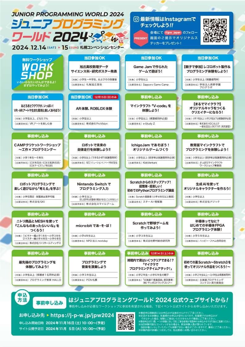 2024年12月14日(土)・15日(日)各日10:00-16:00に開催となるジュニア プログラミング ワールド2024では、昨今話題の生成AIを扱うものや、子どもたちに人気のマインクラフトを活用したものなど、20種類を超えるワークショップを体験いただけます! ワークショップの詳細は以下画像又はイベント公式ウェブサイトにてご確認ください。