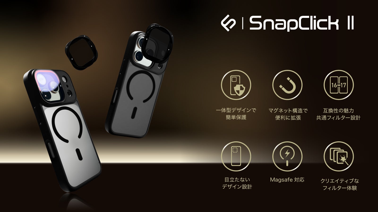 SUNEAST(株式会社 旭東エレクトロニクス)は、スマホケースと撮影フィルターを一体化した「SnapClick」シリーズの最新作 SnapClick II を発表し、近日中に Makuake にて先行公開いたします。