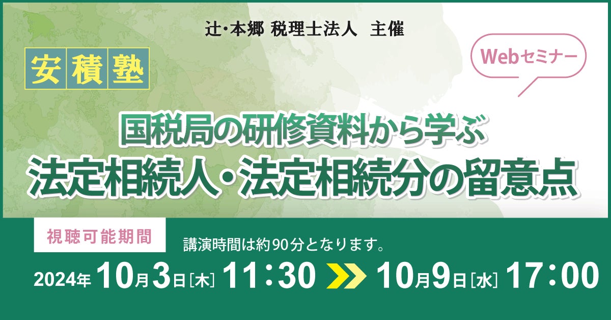 辻・本郷 税理士法人(本社:東京都新宿区、理事長:徳田孝司)は、2024年10月3日(木)より「【安積塾】国税局の研修資料から学ぶ法定相続人・法定相続分の留意点」セミナーを開催いたします。本セミナーでは、東京国税局資産税審理研修資料(令和3年8月作成)を参考に、法定相続人と法定相続分について基礎的な事項から具体的な事例を紹介します。