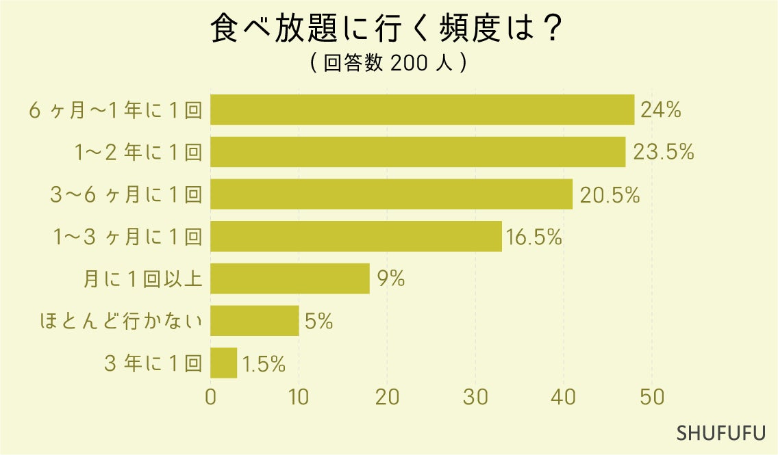 食べ放題に行く頻度は?の問いに対して最も多かったのが「6ヶ月〜1年に1回(24%)」でした。 次いで「1〜2年に1回(23.5%)」「3〜6ヶ月に1回(20.5%)」という結果でした。
