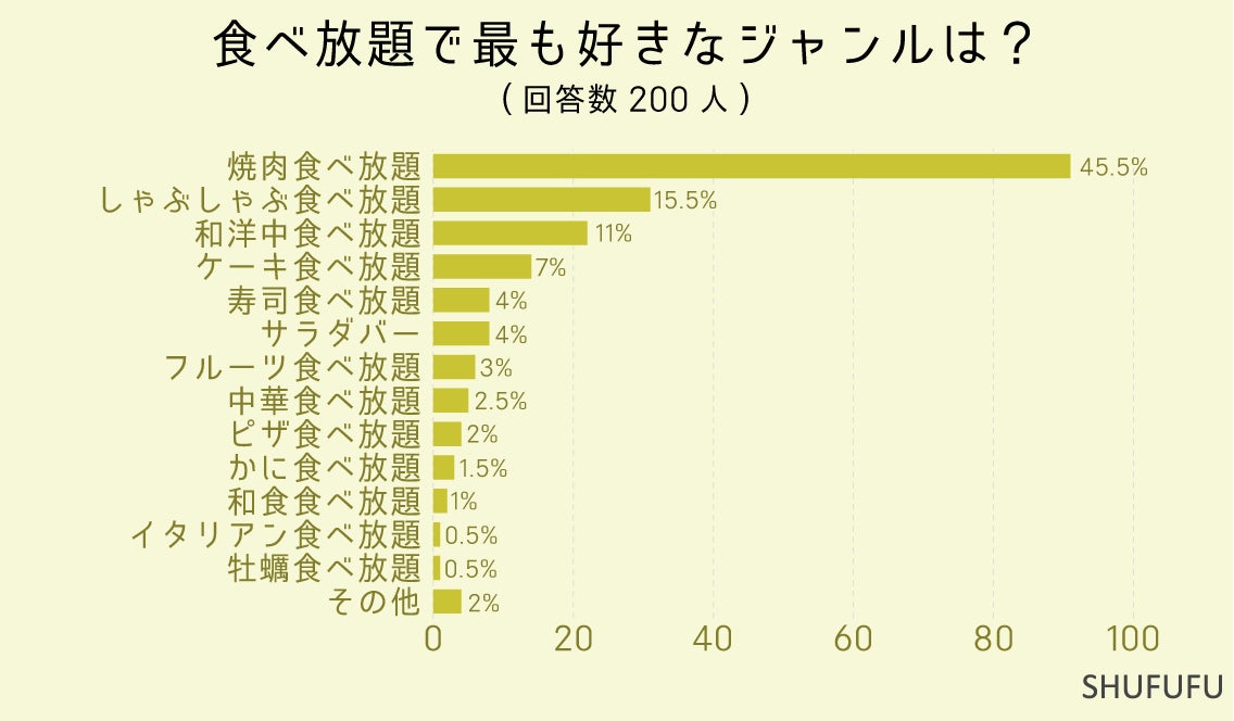 食べ放題で最も好きなジャンルに関しては1位「焼肉食べ放題(45.5%)」、2位「しゃぶしゃぶ食べ放題(15.5%)」でした。1位の焼き肉は、2位の約3倍もの差をつけて圧倒的に支持されていました。