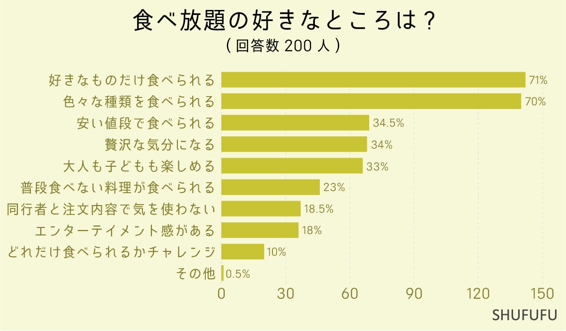 食べ放題の好きなところを尋ねたところ、1位は「好きなものだけ食べられる(71%)」、2位「色々な種類を食べられる(70%)」となりました。食べ放題で単価を気にせずいろいろな種類の中から好きなものをお腹いっぱいになるまで食べれるのは嬉しいですよね。