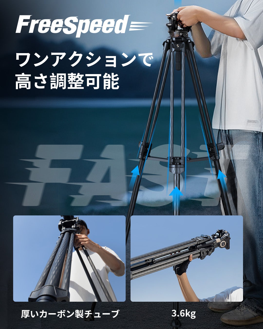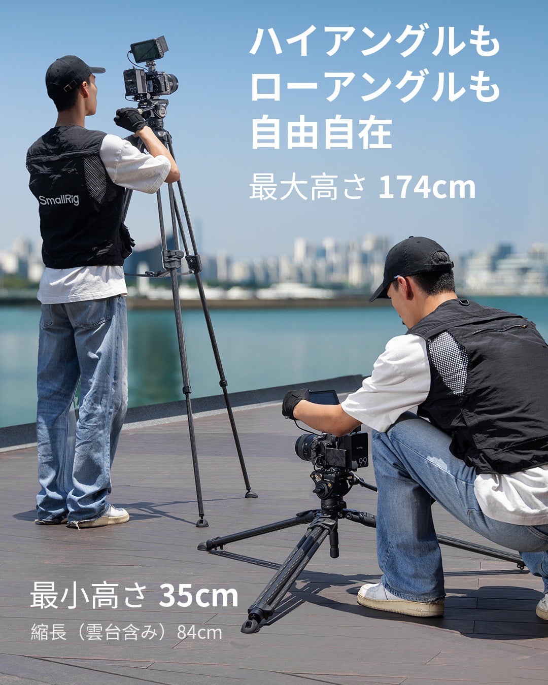 AD-50 Maxは、SmallRigの最新の動画撮影用三脚キットです。ワンアクションで高さ調整が可能なFreeSpeed技術を採用しており、素早く伸縮できます。重量は3.6kgで、持ち運びやすいです。高さは35cmから174cmまで調整可能で、収納長は84cmです。