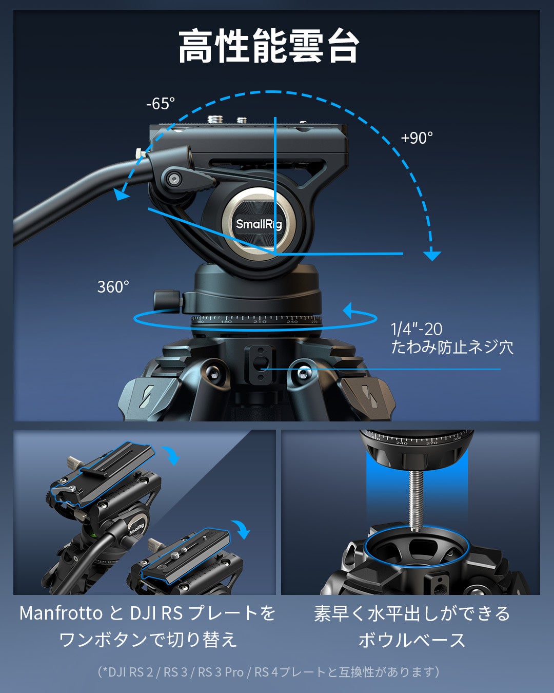 耐荷重8kgの高性能雲台を搭載し、固定式のダンピング機構も備え、スムーズな360°のパンと-65°/90°のチルト動作を実現できます。また、4kgに対応するカウンターバランス(固定)機構も搭載されています。1/4"-20のたわみ防止ネジ穴があり、マジックアームなどのアクセサリーを取り付けるのに便利です。