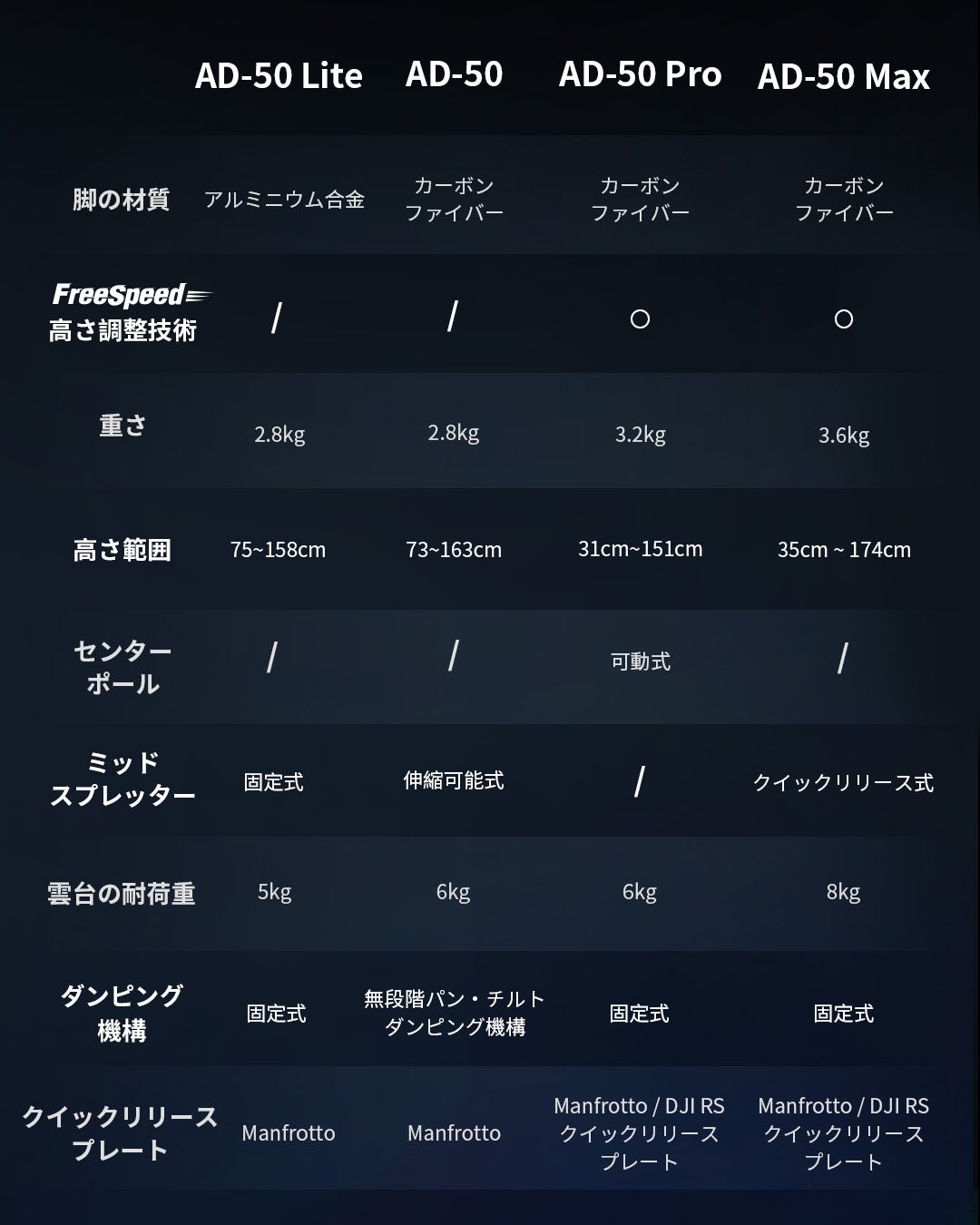 AD-50シリーズには、現在AD-50 Lite、AD-50、AD-50 Pro、AD-50 Maxの4種類の製品があります。それぞれ、異なるニーズに対応した特徴を備えており、動画撮影や撮影環境に合わせて最適なモデルを選ぶことができます。