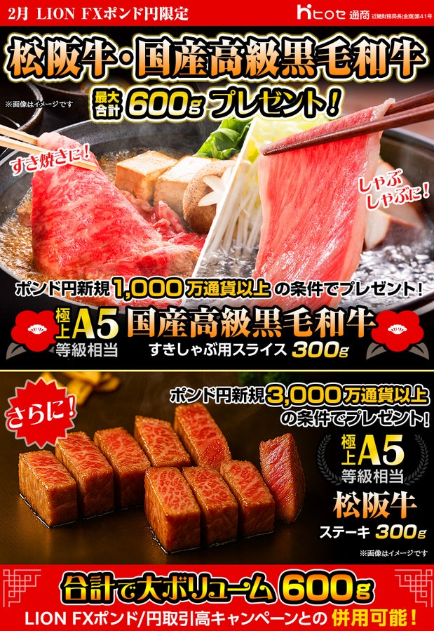 ヒロセ通商株式会社 (本社:大阪府西区、代表取締役:野市 裕作、以下:当社)は、当社の提供する「LION FX」において、2026年2月2日(月)より、「LION FXポンド円限定 松阪牛・国産高級黒毛和牛最大600gプレゼントキャンペーン」を実施することをお知らせいたします。