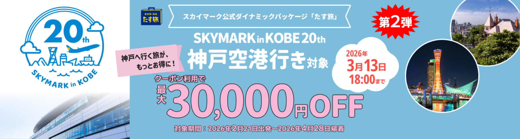 【WEB予約限定】ダイナミックパッケージ『たす旅』にて神戸空港就航20周年キャンペーン実施中!最大30,000円引きの期間限定クーポンを使っておトクに旅しよう!お安い航空運賃は早い者勝ち♪今すぐご希望のご出発日でチェック!