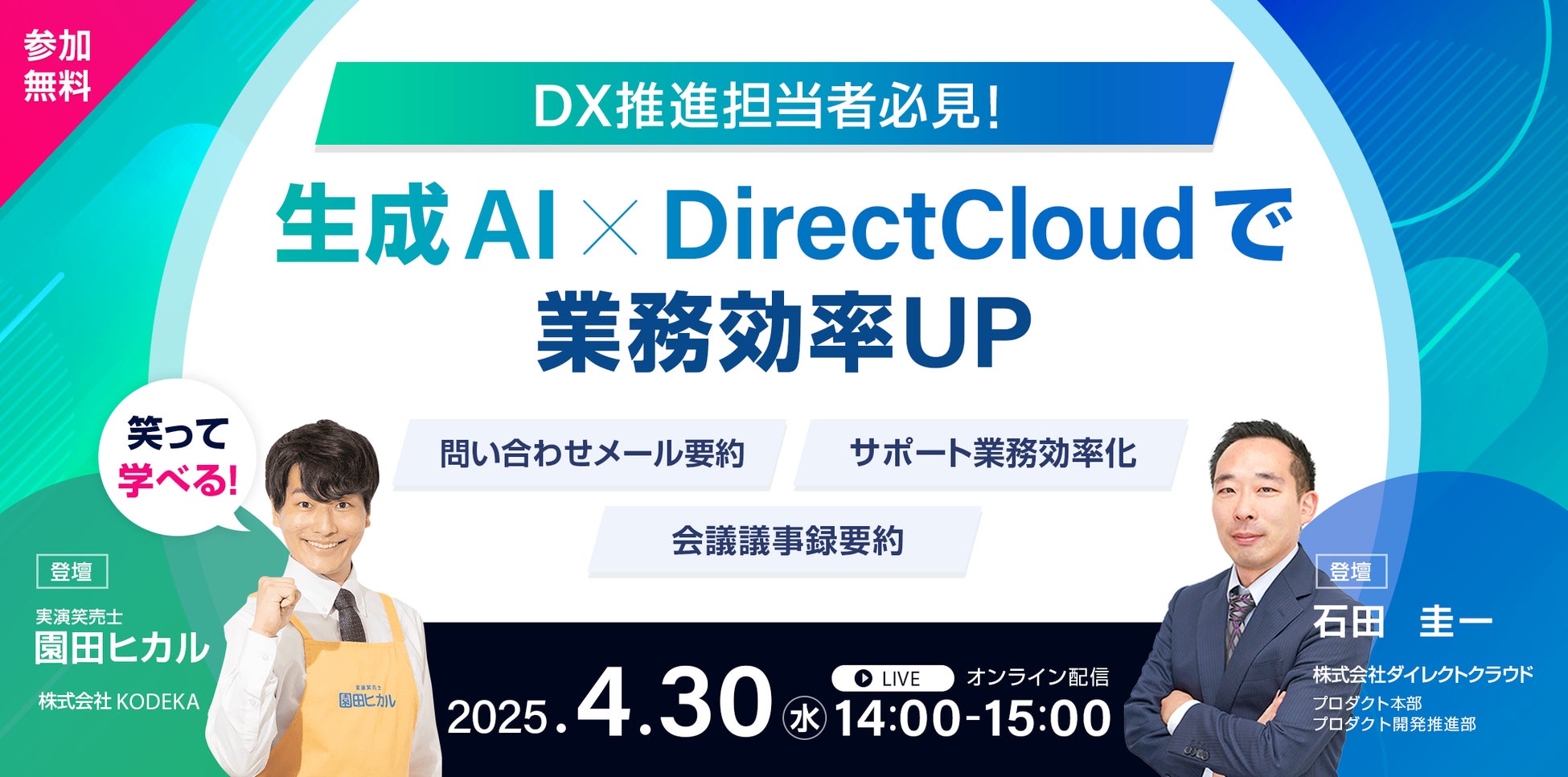 DirectCloudで更なるドキュメントデータ活用を推進する株式会社ダイレクトクラウド(本社:東京都港区、代表取締役:安 貞善、以下ダイレクトクラウド)は、2025年4月30日(水)に「生成AI×DirectCloud」をテーマに特別ゲストを迎えてウェビナーを開催いたします。