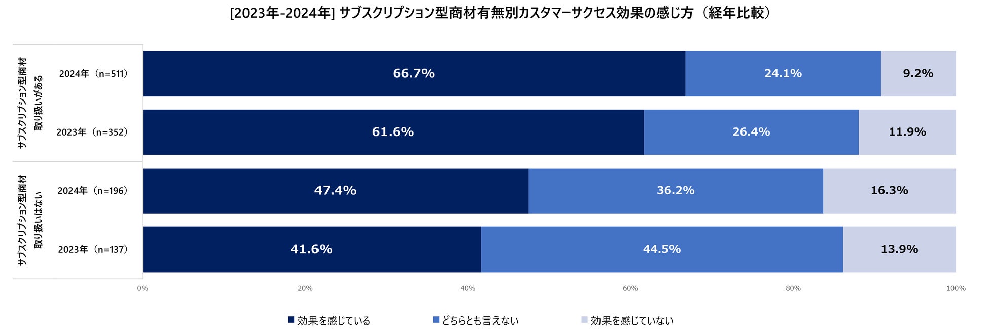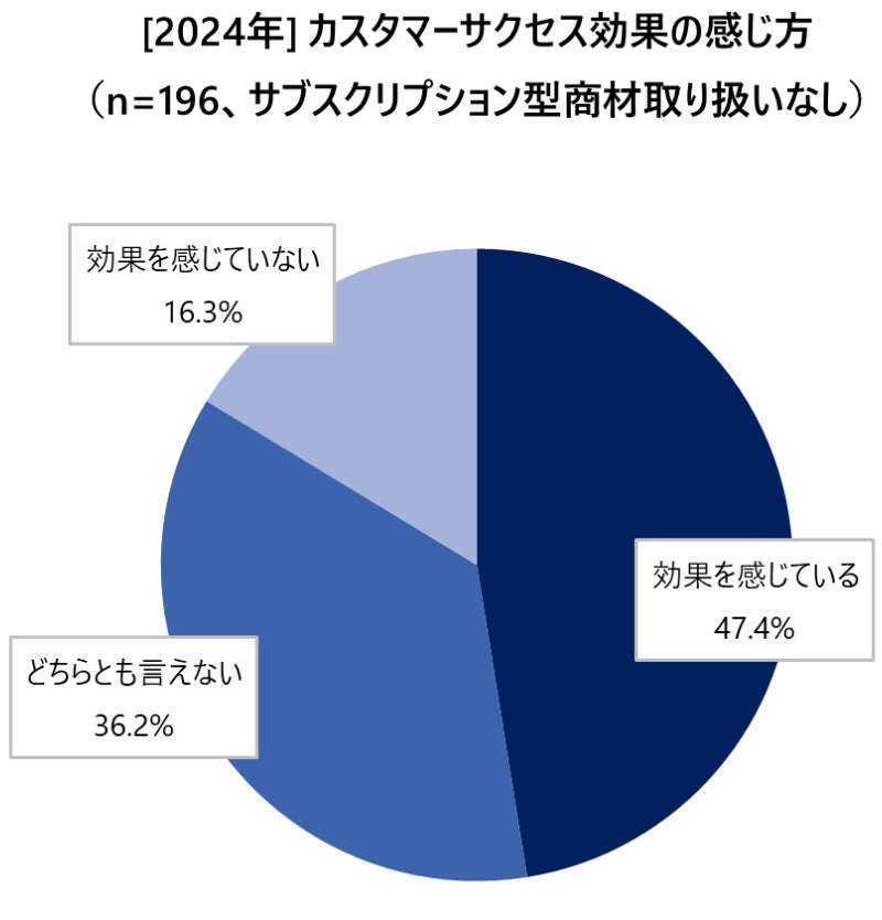 さらに、サブスクリプション型商材取り扱いありなし別で効果体感度合いを見てみると、サブスクリプション型商材を取り扱っている企業でカスタマーサクセスの効果を感じている人は66.7%、取り扱いがない企業では47.4%と、いずれも昨年より約5ポイント強の増加という結果となりました。「サブスク」型ビジネスにおいては効果を感じられていない人の割合は1割以下にとどまっており、カスタマーサクセスと相性がよいとされていることが改めてわかる結果となりました。「サブスク」型ではないビジネスにおいても、カスタマーサクセスの取り組みによって効果を得ている企業が多くあることがわかります。